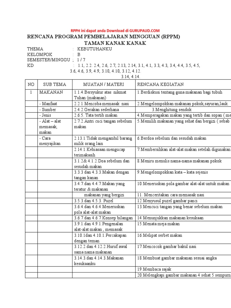 Rencana Kegiatan Mingguan Rppm Paud from data03.123doks.com Maybe you would like to learn more about one of these? Rppm tema kebutuhanku subtema makanan dan minuman. Check spelling or type a new query. We did not find results for: