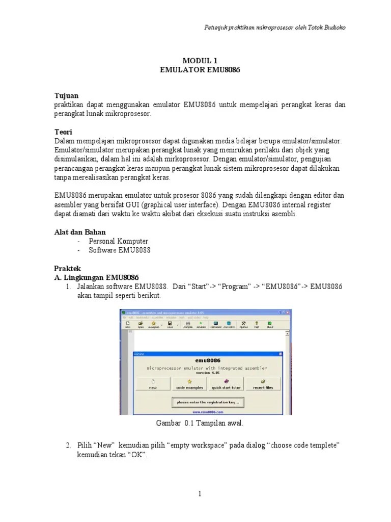 Setiap penjelasan pada buku ini akan disertai dengan contoh program yang sesederhana dan semenarik mungkin agar mudah dimengerti. Penggunaan program emu8086 menurut pengalaman penulis sangat cocok. Bab 2 bahasa assembly dan emu8086. Filetype asm disertai contoh 86 project program Berbagai contoh aplikasi pemrograman assembly dan teknologi pengembangannya diberikan yang meliputi. Program menampilkan kalimat menggunakan emu8086. Proses pencarian kesalahan lebih mudah. Emu8086 merupakan aplikasi emulator bagi pemrograman bahasa assembler atau . Ada cara yang mudah dalam emu8086 untuk merubah angka. 17 contoh program mendemonstrasikan penggunaan instruksi mov: Org 100h mov ah,0eh mov al, 'a' int 10h mov al, 'b' Operasi aritmatika di program emulator 8086. Opcode dari contoh di atas adalah mov, sedangkan operandnya adalah ax, bx.